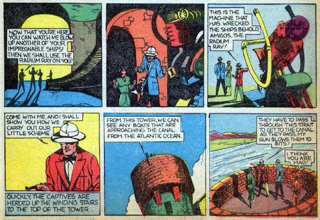 Senor Anza here is one of your scientists with mysterious motivations: he's been blowing up passing ships on their way to or from the Panama Canal using his very cool Radium Ray, but just why he's doing it is not elaborated on. Top possibilities are "as a weapons test prior to some other scheme" and "on behalf of the Axis forces" with a possibility of "straightforward homicidal madness" but as Anza ends up stone dead at the hands of super-spy K-51 and his colleague/ fiance/ fellow super-spy Z-19 all speculation is purely academic. (Wonderworld Comics 004, 1939)