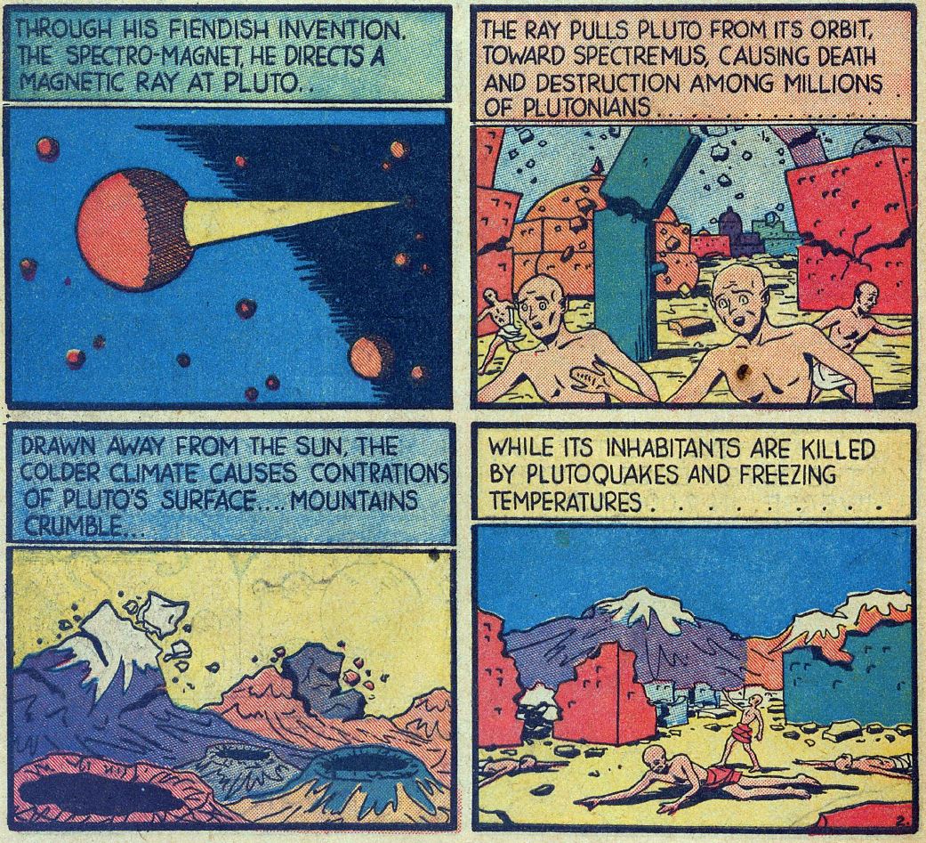 Like, yes, Quorak's device can and does pull Pluto toward his base on planetoid Spectremus (excellent name), but why. What is he going to do with a planetload of wrecked cities and dead Plutonians? Is the destruction the point? Then why not push Pluto into the Sun or something? Why pull it?