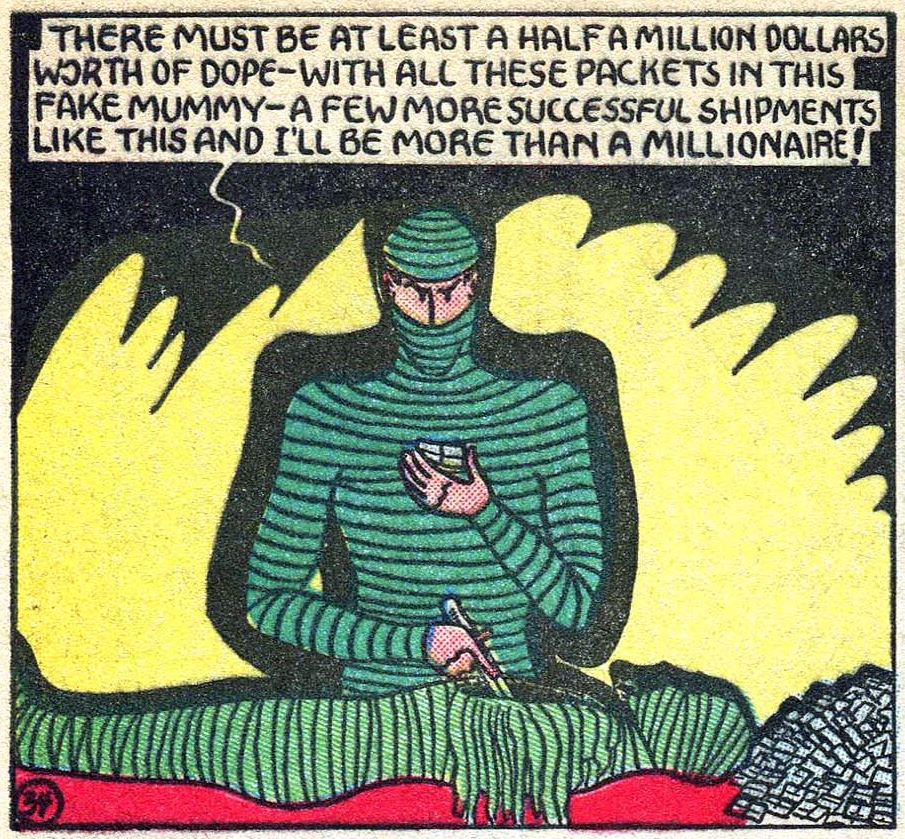 Like every other of my long-term projects, writing this blog has been an exercise in taking a simple premise (writing fairly succinctly about minor DC Comics super-villains) and expanding the scope until the seams start to creak (writing somewhat extensively about all super-villains and super-heroes and a bunch of other comics things and also maintaining a set of variably-useful indices about them all). This is all to lead into the fact that a comic I was just reading (Super Spy 001, 1940) contained a reprint of a story from a comic I read back when I started doing this and I was absolutely flummoxed that I had not written about the Missing Mummy.