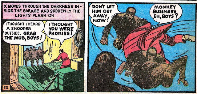 The thing about a gang made up of a bunch of guys in gorilla suits is that it is pretty easy to infiltrate, and X does just that, tagging along as Dr Horton, the supposed researcher who supposedly accidentally lost the gorillas, orchestrates an all-out attack on City Hall to loot the town treasury before presumably wrapping up the entire operation and skipping town. Horton's luck has run out, however, and he is corralled with relative ease by the Man of a Million Faces.