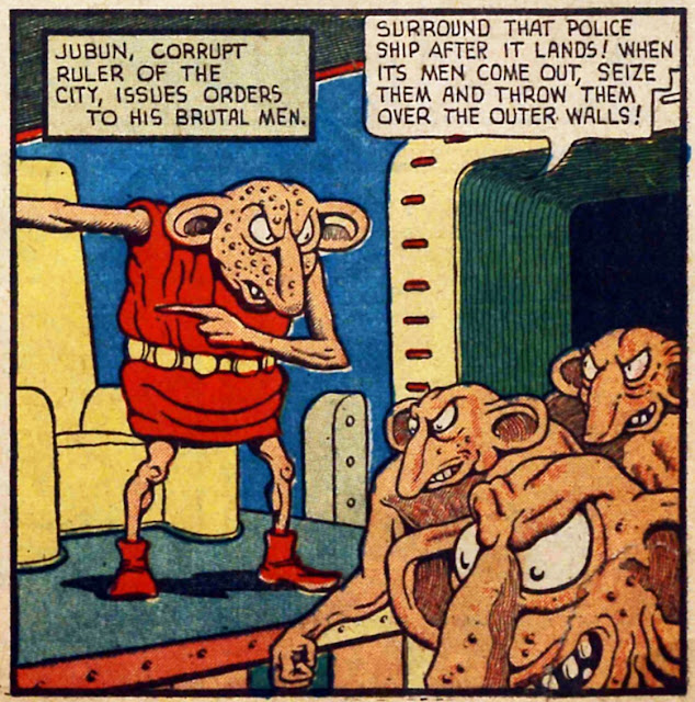 This gang of space pirates that Spacehawk and his pal Galar beat up are described as "screaming, bloodthirsty Neptunians, Plutonians and Jovians" and this is somewhat vexing because they are an extremely heterogeneous bunch who absolutely come in more than three distinct styles, but I reckon that we can do it. The Neptunians are described in a couple of places as "Neptunian Dog-Men" so let's say that they make up the bulk of the group, the light orange ones. With the exception of the camel-faced guys lugging hoses in the first panel above - they seem distinct and arbitrarily reading left to right I'm going to say that they are Plutonians, which means that all of the green lizardy guys are by default Jovians, even the one with tentacles.